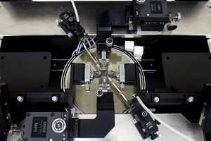The dedicated and extremely rigid probe platen design accommodates two bold->down MP80 large area MicroPositioners in east-west configuration. Four port RF measurements or DC biasing is easy possible by having two North and South “bridges” as a standard configuration.